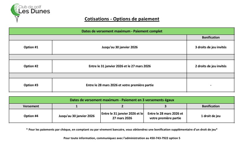 | Membre 7 jours – Après 11h30 ou après 14h Membre – Après 11h30 Membre – Après 14h > Réservation 10 jours à l’avance > Privilège à la boutique 15% > Qualification interclub > Eligible regroupement PAR > Entreposage et nettoyage des bâtons > Casier > Chariot à main | 2400$ 1875$ |